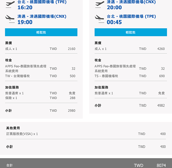 還順便買了保險,加了台灣機場稅和泰國機場總共是NT8074